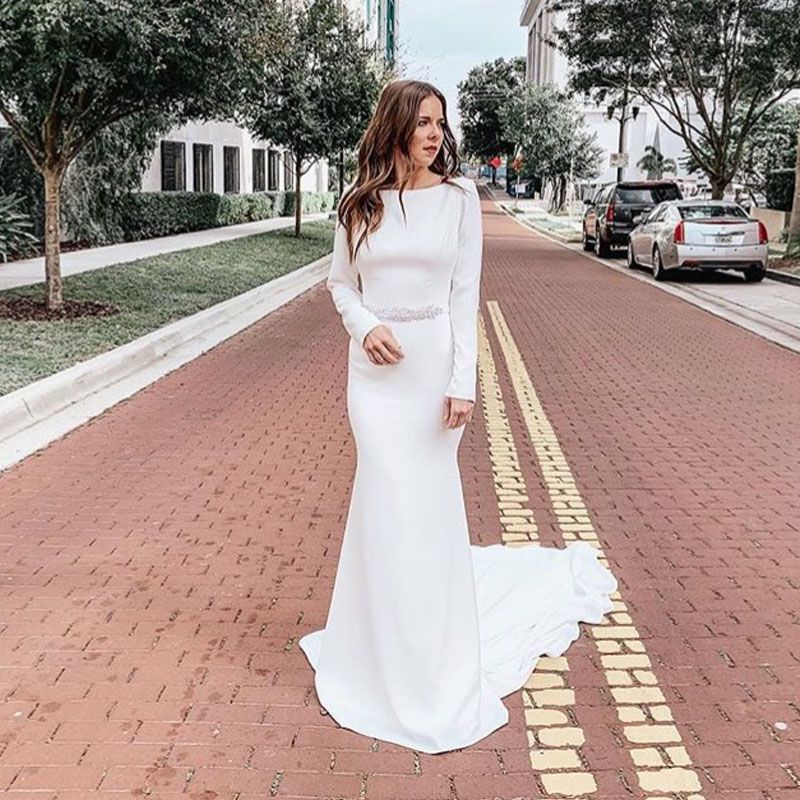 2019 Mermaid Satin Wedding Dresses Long Sleeves Bridal Gowns Diamonds Belt Bride Dresses Chaple Train Backless White Ivory Wedding Gowns