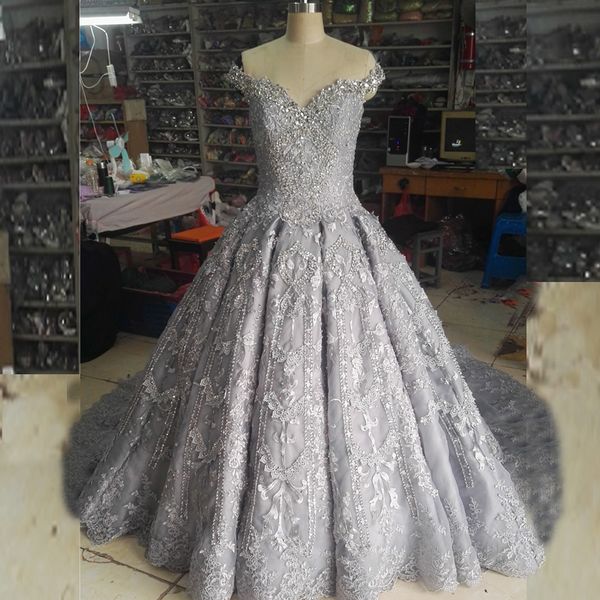 Silver Wedding Dresses Ball Gowns Lace Flowered Beaded Off The Shoulder