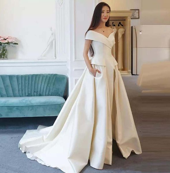 Simple Asian Designer Young Ladies Vestido De Fiesta Satin Evening Long Dress White Off Shoulder Sweep Train Elegant Prom Dress Plus Size Formal