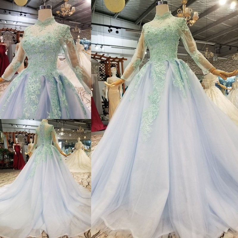 2014 Real Sample Egypt Wedding Gowns High Neck Long Sleeve Appliqued A Line Court Train Lace Bridal Dresses