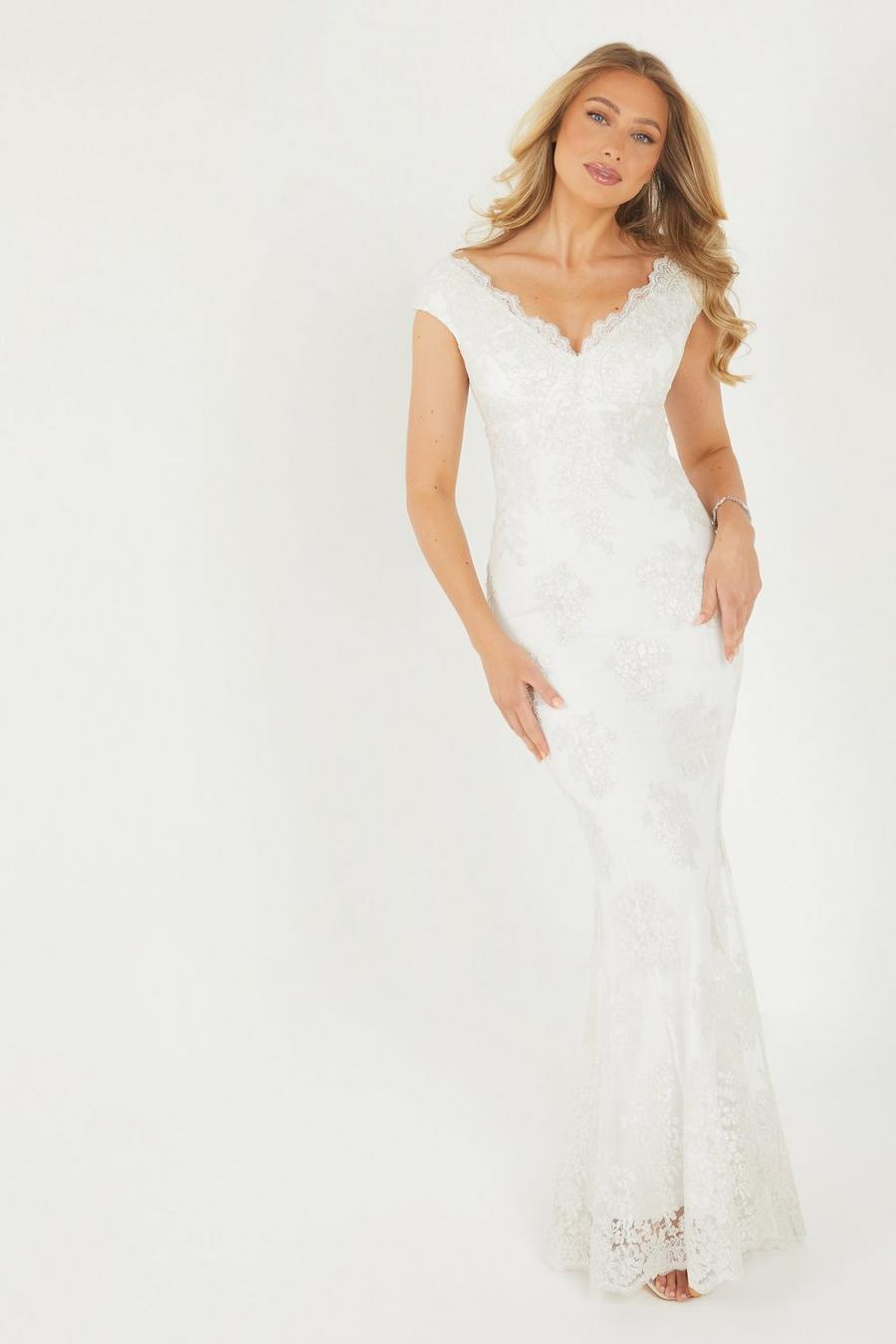 Quiz Meghan White Crepe Bardot Sequin Lace Fishtail Bridal