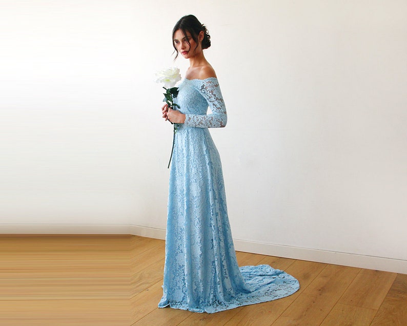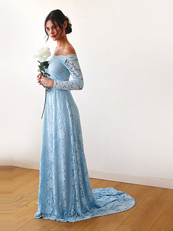 Light Blue Wedding Dress With A Train Off The Shoulder Light Blue Lace Maxi Dress Wedding Dresses With Trains 1148