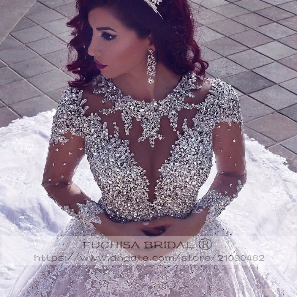 Sheer Long Sleeves Sparkly Wedding Dresses Long Train Sheer Back Middle East Bridal Dresses Gowns Sequins Beads