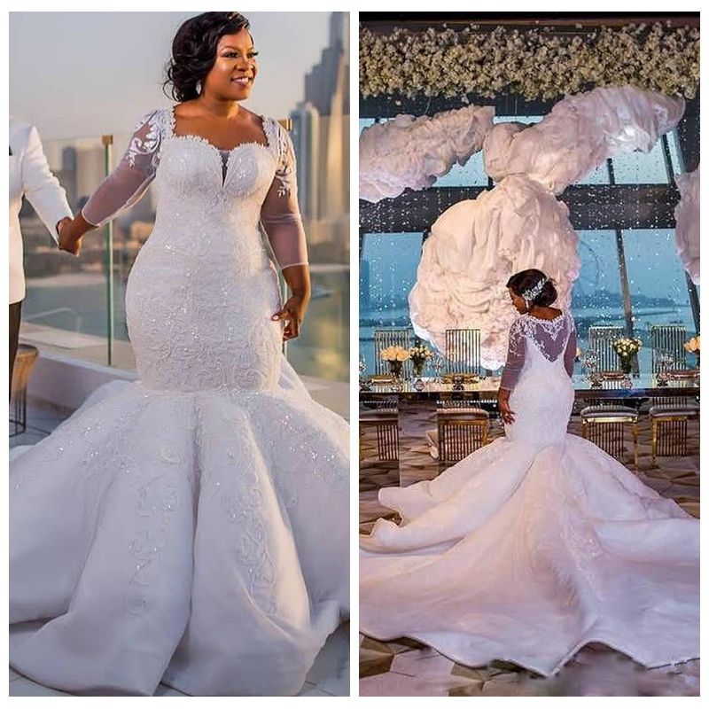 2019 Long Mermaid Slim Wedding Dress Sparkle Sequins Beads Lace Applique Bridal Gown Custom Vestidos De Mariage Plus Size Wedding Wear