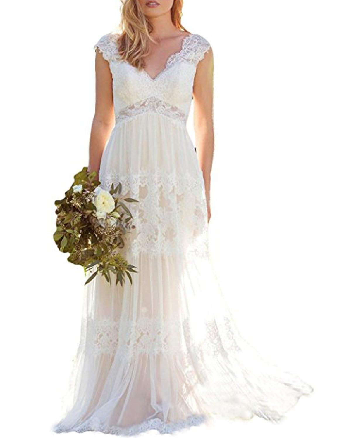 Details About Boho Beach Cap Sleeve Empire Waist Wedding Dresses Sexy Lace Country Bridal Gown