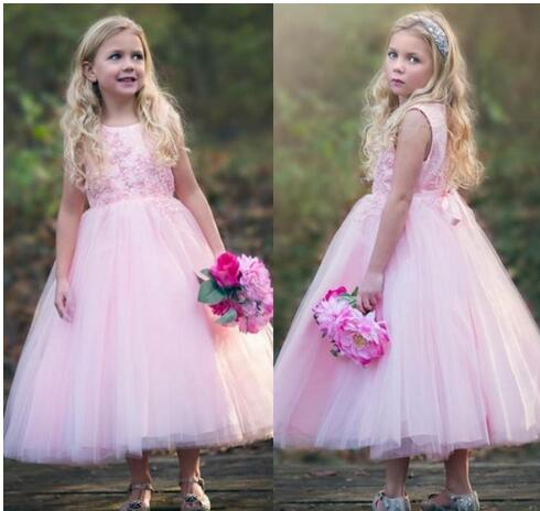 2018 Cute Pink Jewel Neck A Line Toddler Kids Flower Girl Dresses For Western Country Weddings Princess Tea Length Girls Birthday Dress