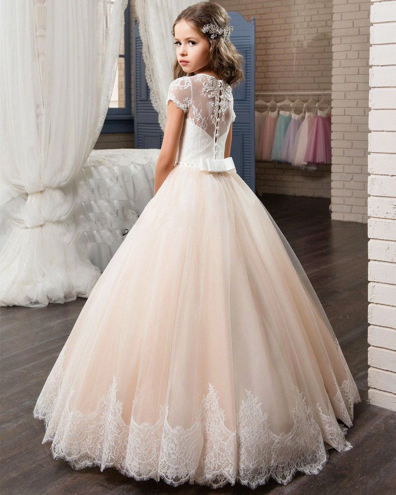Adorable Lace Tulle Flower Girl Dresses For Western Garden Weddings A Line Princess Crew Neck Cap Sleeves Appliques Long Kids Formal Gowns