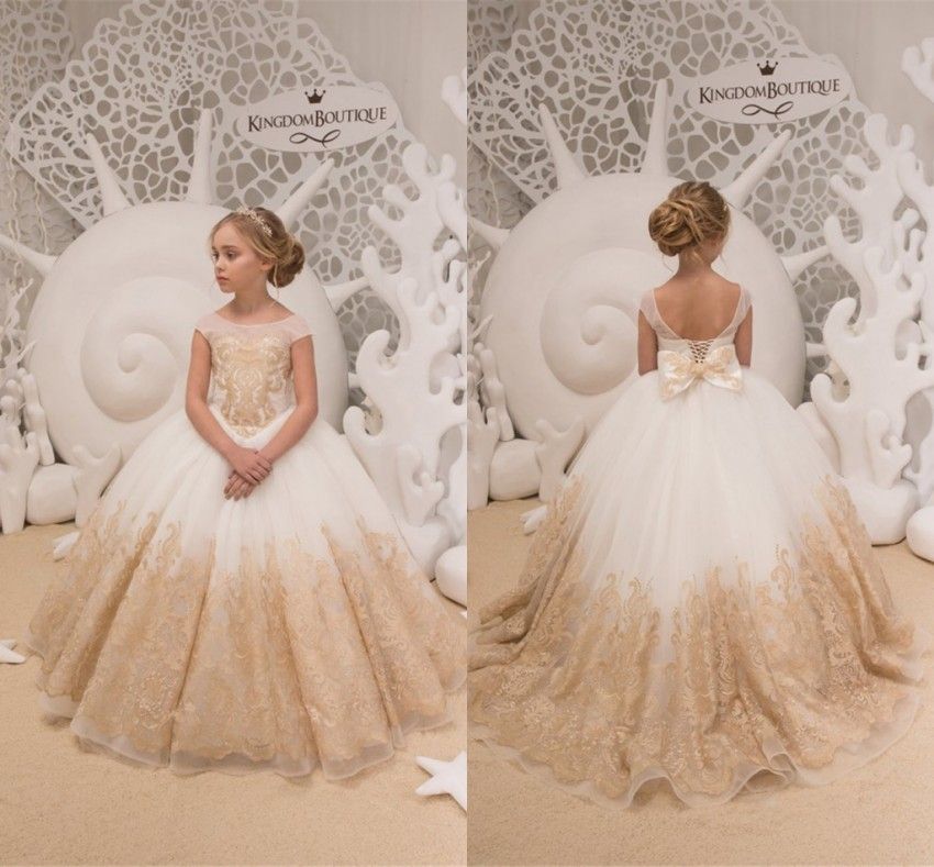 2019 New Arrival White With Gold Appliques Formal Flower Girl Dresses For Western Weddings Ball Gown Sheer Cap Sleeves With Bow Back Dress