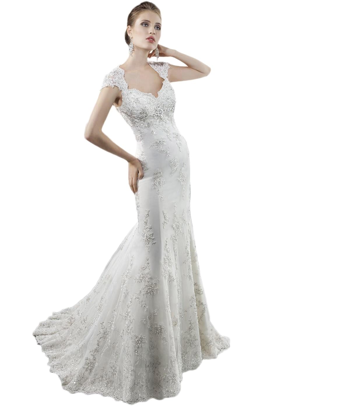 White V Neck Cap Sleeve Open Back Wedding Dresses Lace Bridal Dresses